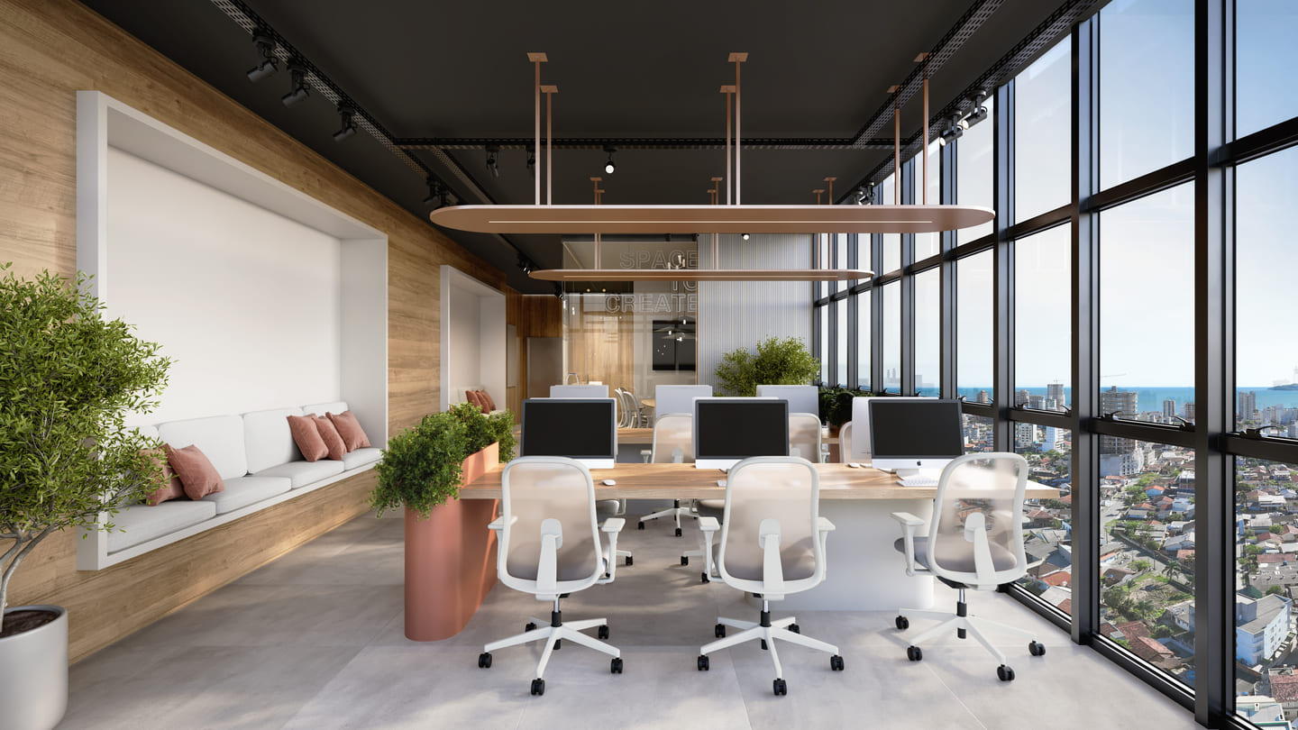 Cada planta conta com elementos essenciais para o uso corporativo moderno: sacadas generosas com vista panorâmica, lavabo privativo, ambientes integrados para recepção e atendimento, além de infraestrutura para ar-condicionado, internet de alta velocidade, cabeamento inteligente e acessibilidade universal. A versatilidade das metragens permite inclusive a unificação de unidades, possibilitando a criação de grandes centros privativos dentro do empreendimento.