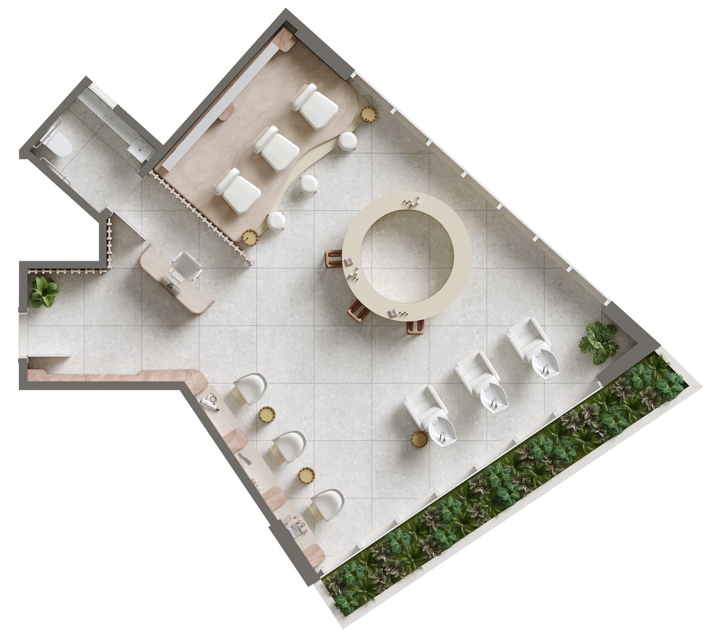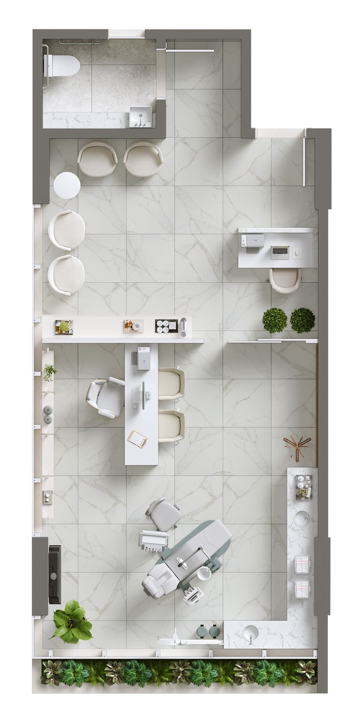 O layout inteligente proporciona maior aproveitamento dos espaços e uma estética refinada, com acabamentos de alto padrão e integração visual entre os ambientes. O Brickell Business permite que cada profissional configure sua sala com total liberdade, alinhando identidade de marca, conforto e excelência funcional.