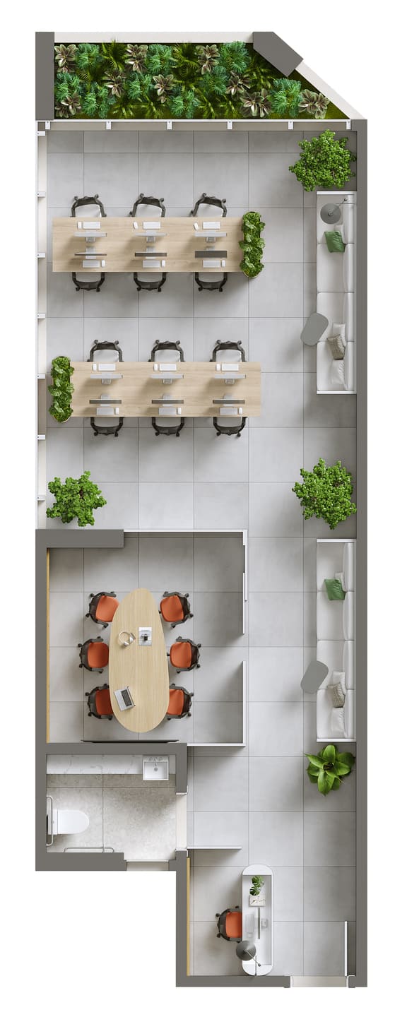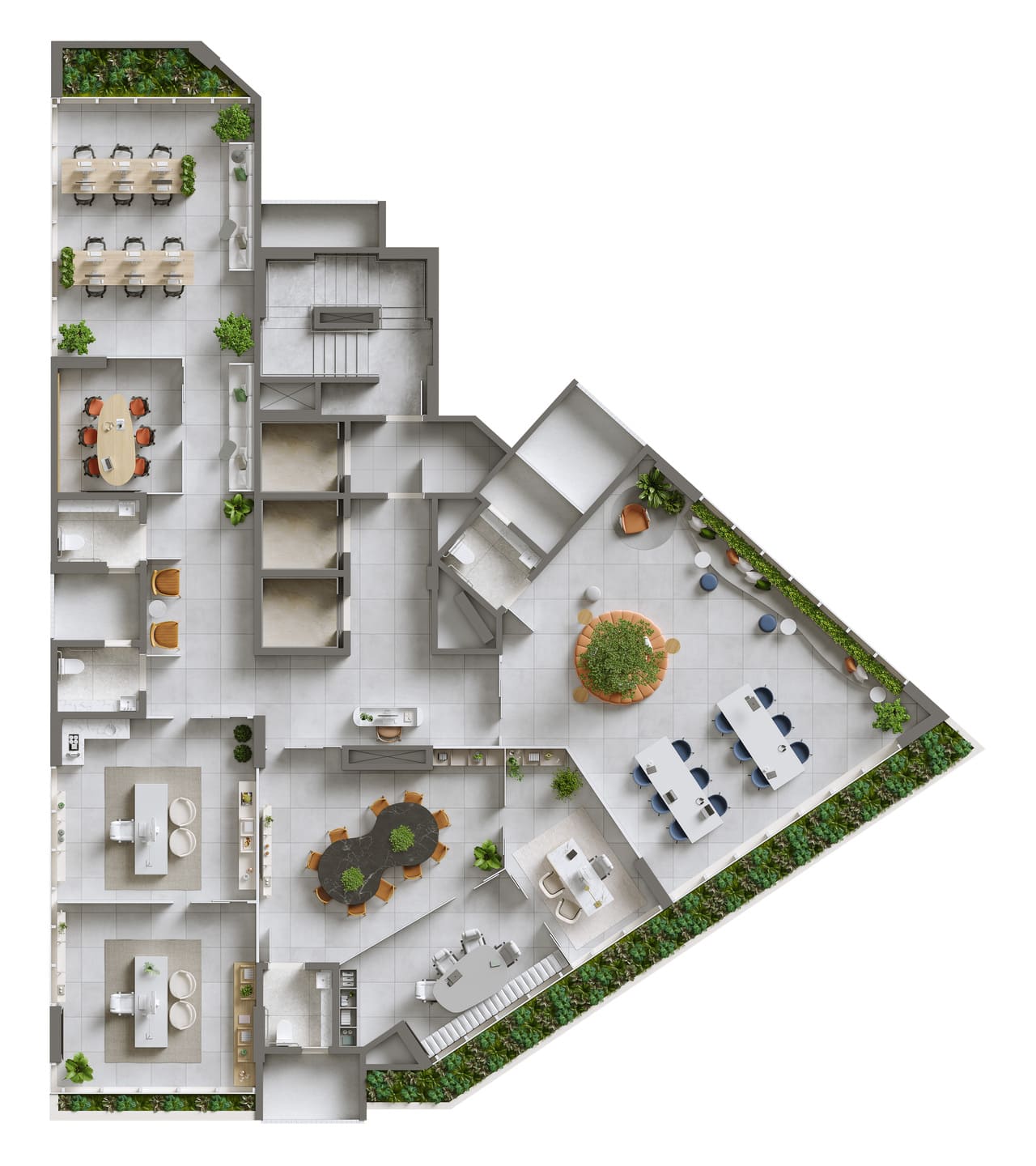 As áreas comuns foram desenvolvidas com arquitetura biofílica, priorizando o contato com o verde, iluminação natural e sensações de conforto visual. Os ambientes contam com hall de entrada decorado, recepção funcional, sala de reuniões equipada, espaços abertos com mobiliário contemporâneo e um jardim urbano que cerca a fachada. Tudo isso proporciona um ambiente inspirador para produtividade e encontros profissionais.