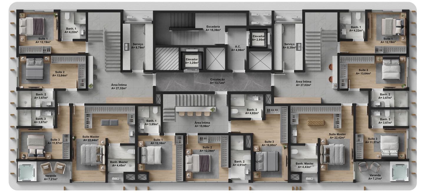 As unidades contam com varandas generosas com churrasqueira, lavabo, área de serviço separada e acabamentos de alto padrão. Já as coberturas elevam o conceito de moradia, com vistas panorâmicas e ambientes pensados para momentos únicos. Cada planta valoriza a iluminação natural e o fluxo entre os espaços, garantindo uma experiência de vida contemporânea, funcional e verdadeiramente confortável em Porto Belo – SC.