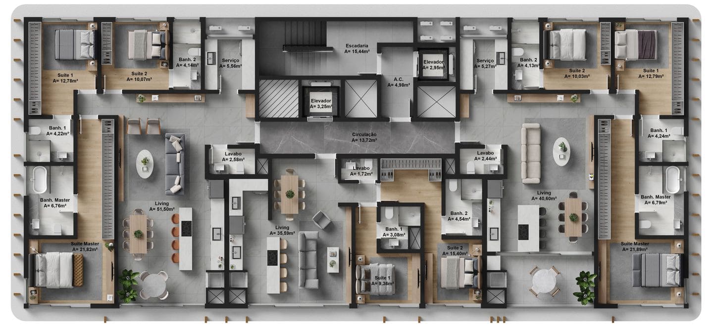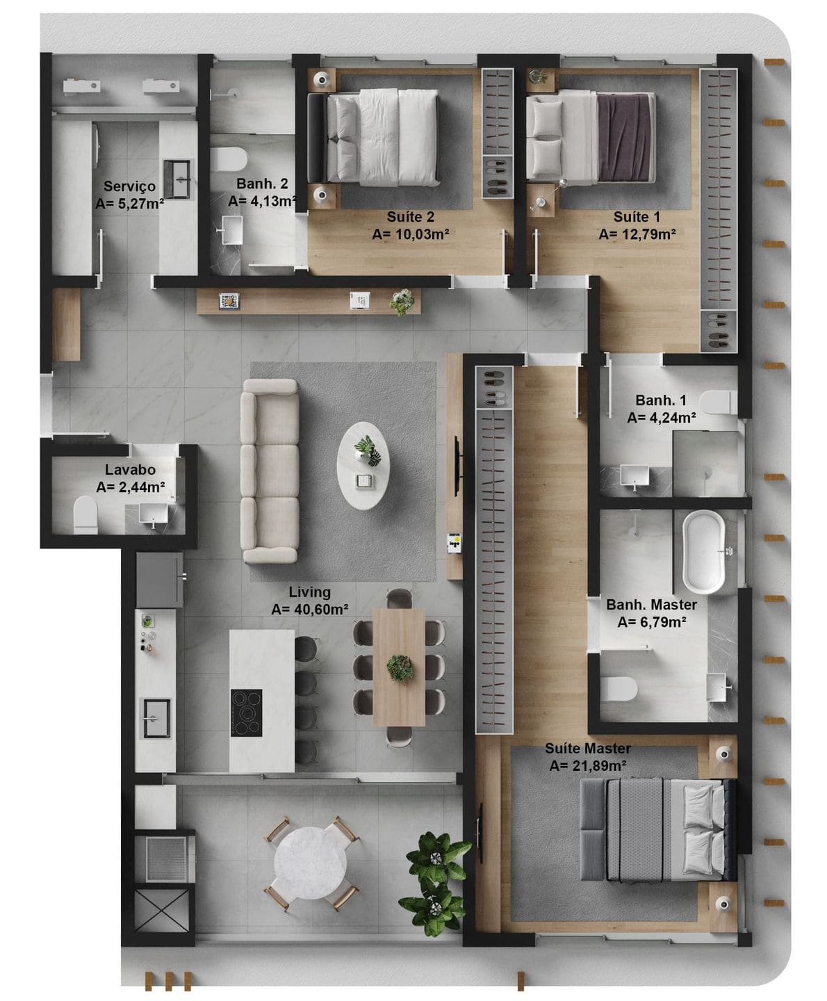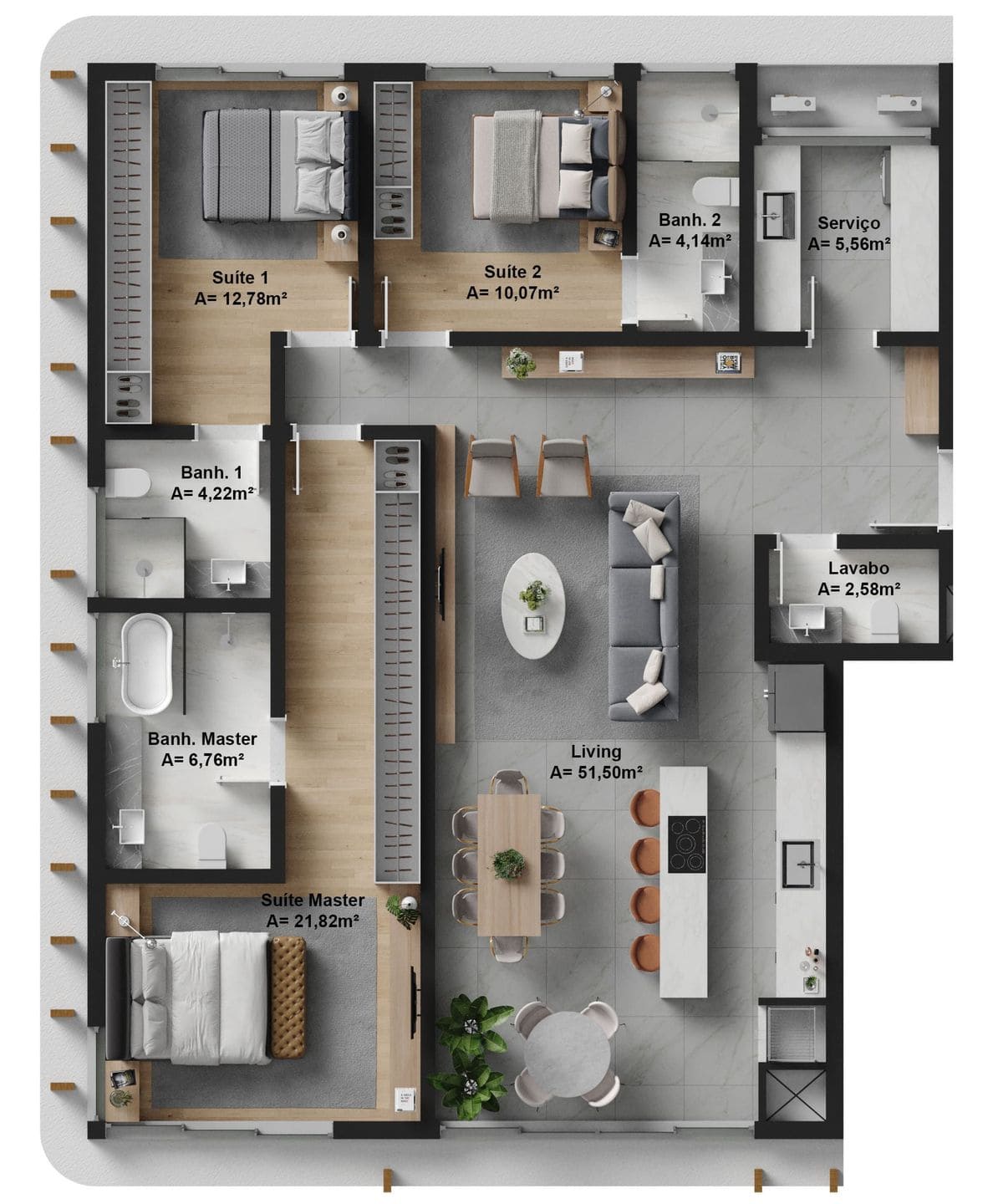 As plantas foram cuidadosamente desenvolvidas para oferecer versatilidade, sofisticação e aproveitamento inteligente dos ambientes. Com metragens que vão de 86 m² a 280 m² e tipologias de 2 a 4 suítes, atendem desde jovens casais até famílias que buscam mais espaço e exclusividade. Os layouts integram áreas sociais como sala de estar, jantar e cozinha gourmet, promovendo amplitude e praticidade no dia a dia.