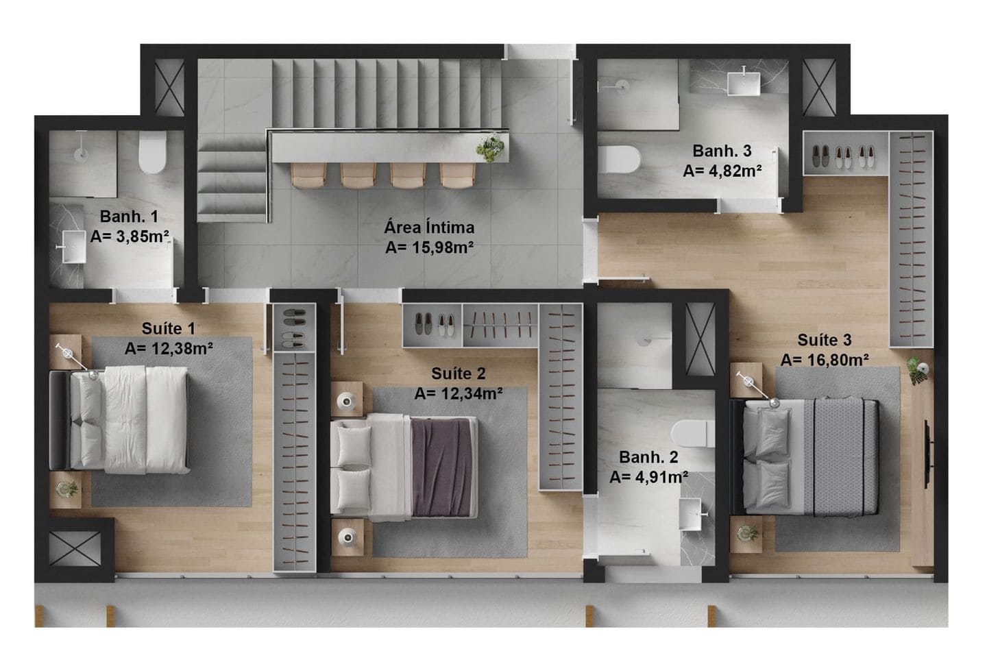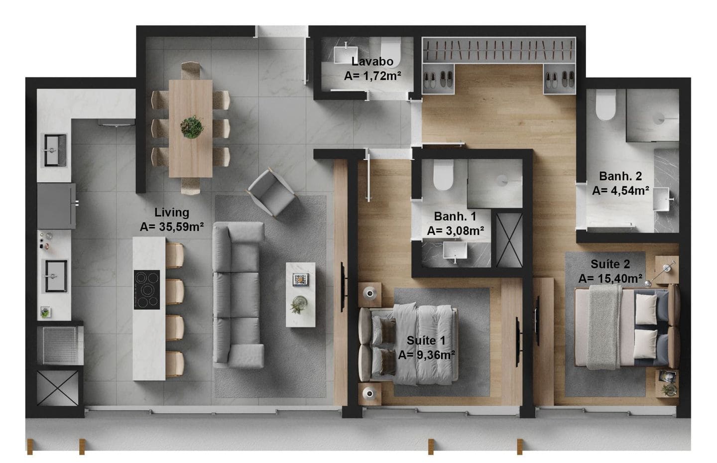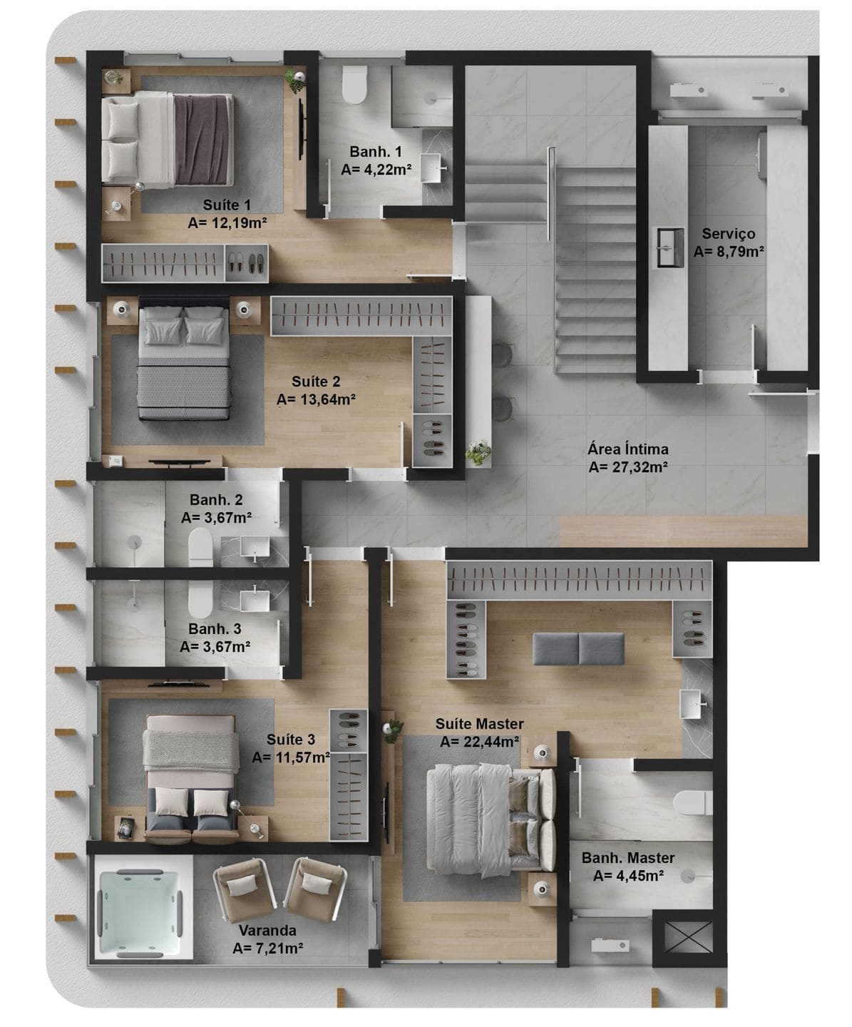 As plantas foram cuidadosamente desenvolvidas para oferecer versatilidade, sofisticação e aproveitamento inteligente dos ambientes. Com metragens que vão de 86 m² a 280 m² e tipologias de 2 a 4 suítes, atendem desde jovens casais até famílias que buscam mais espaço e exclusividade. Os layouts integram áreas sociais como sala de estar, jantar e cozinha gourmet, promovendo amplitude e praticidade no dia a dia.