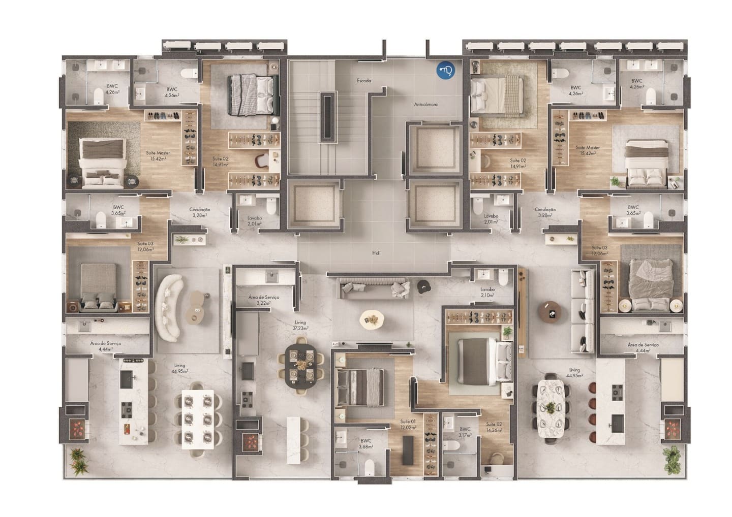 Com opções de 86,39 m² e 122,43 m² de área privativa, os apartamentos do Duomo Di Trento Residence oferecem diferentes configurações para se adequar ao estilo de vida de cada morador. As unidades com 2 ou 3 suítes contam com lavabo, área de serviço, varanda gourmet e living espaçoso. O layout inteligente proporciona integração e conforto, ideal para famílias que valorizam sofisticação, funcionalidade e exclusividade em Porto Belo – SC.