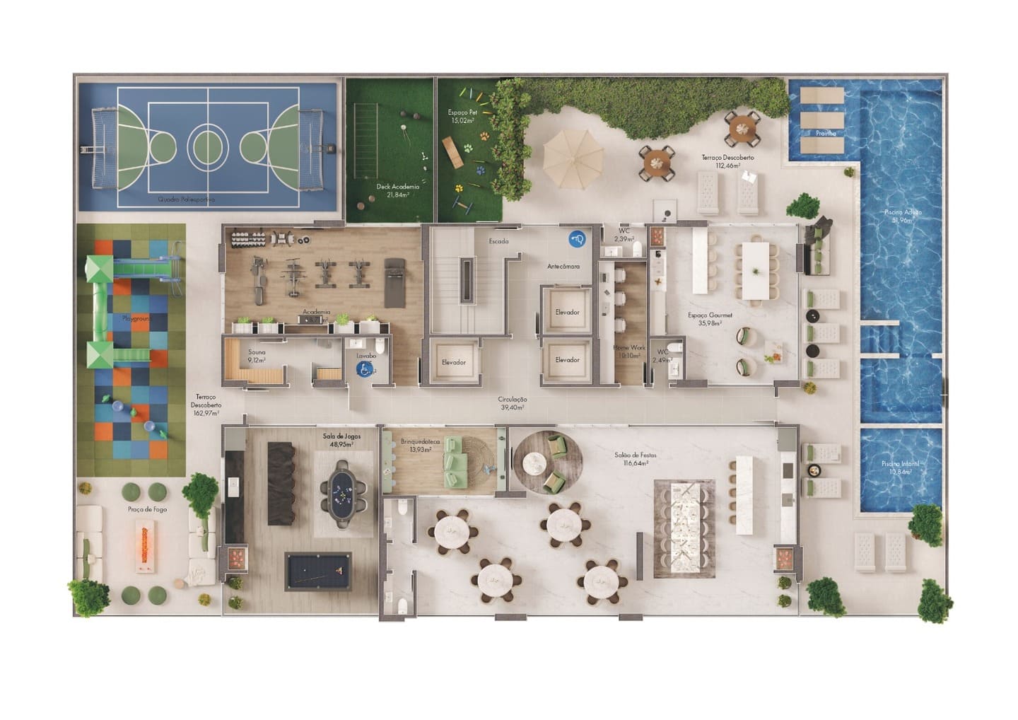 A experiência vai além com a quadra poliesportiva, o espaço pet para os companheiros de quatro patas e uma charmosa praça de fogo — perfeita para conversas sob as estrelas. O empreendimento ainda oferece áreas de home work, terraços descobertos, acessibilidade completa e ambientes que inspiram bem-estar em cada detalhe.