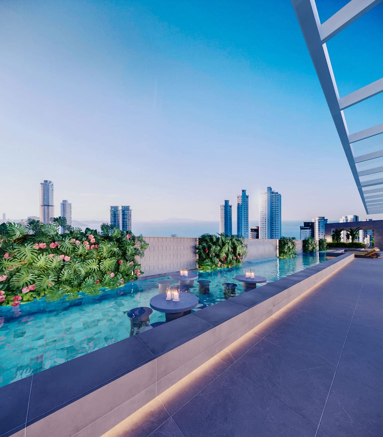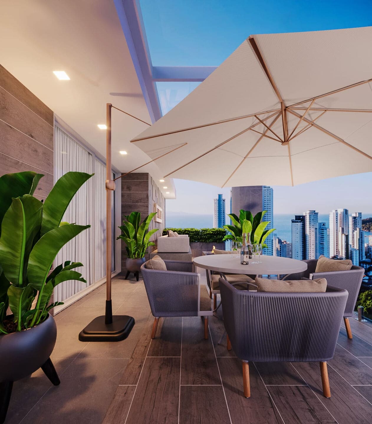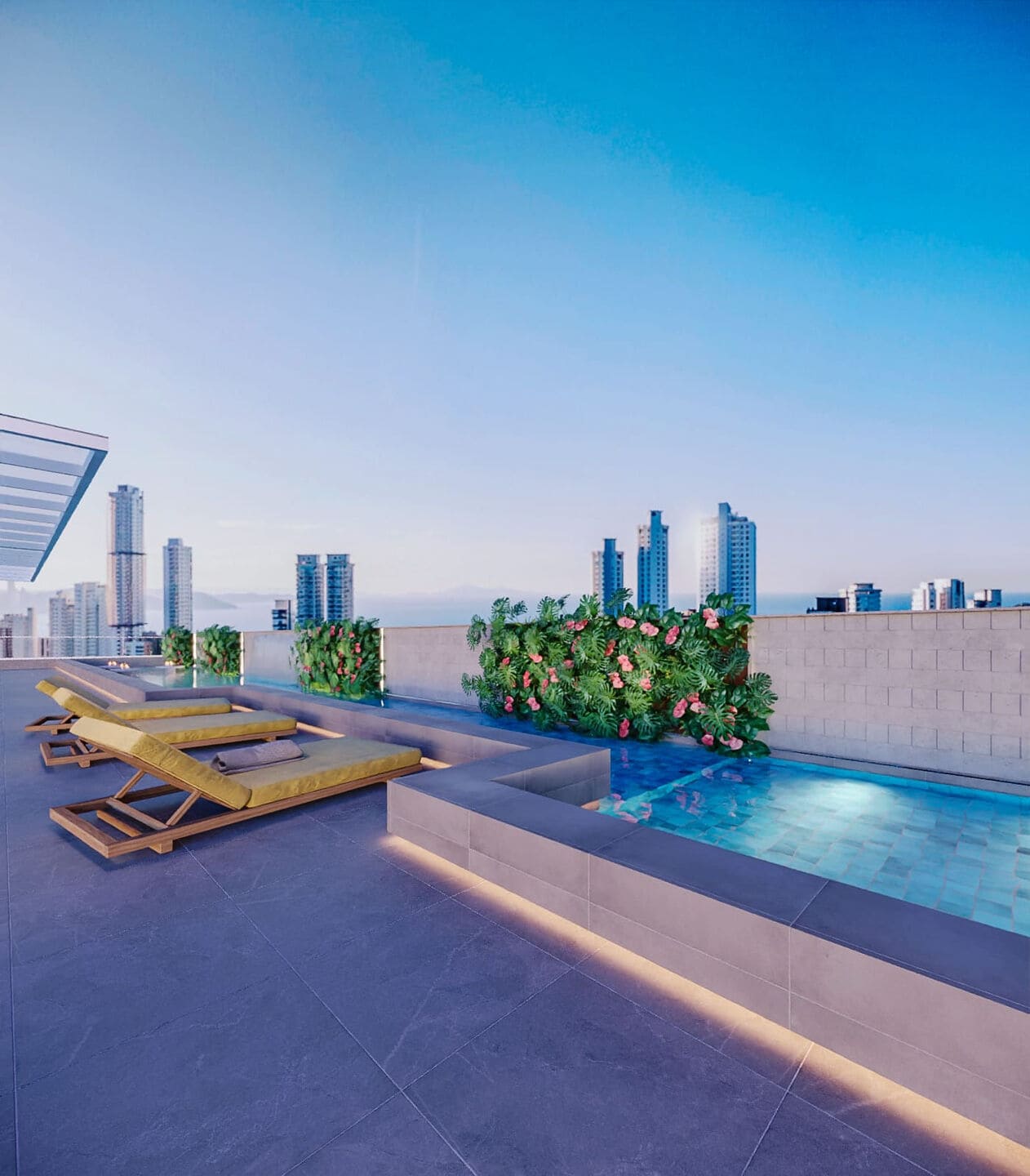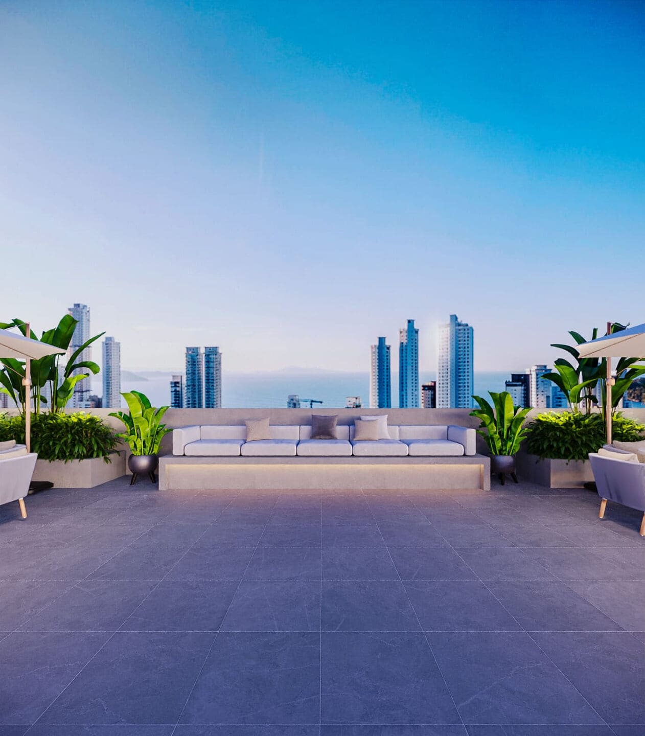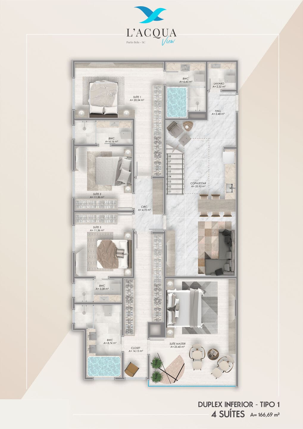 Destaque para as coberturas duplex, com lazer privativo e piscina com borda infinita. A vista para o mar está presente em todos os tipos, reforçando a exclusividade do L’Acqua View. Um projeto que une excelência construtiva e estilo em Porto Belo – SC.