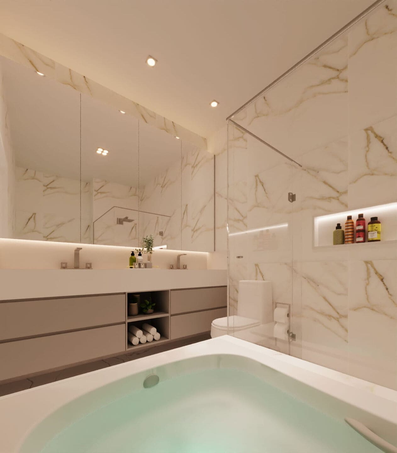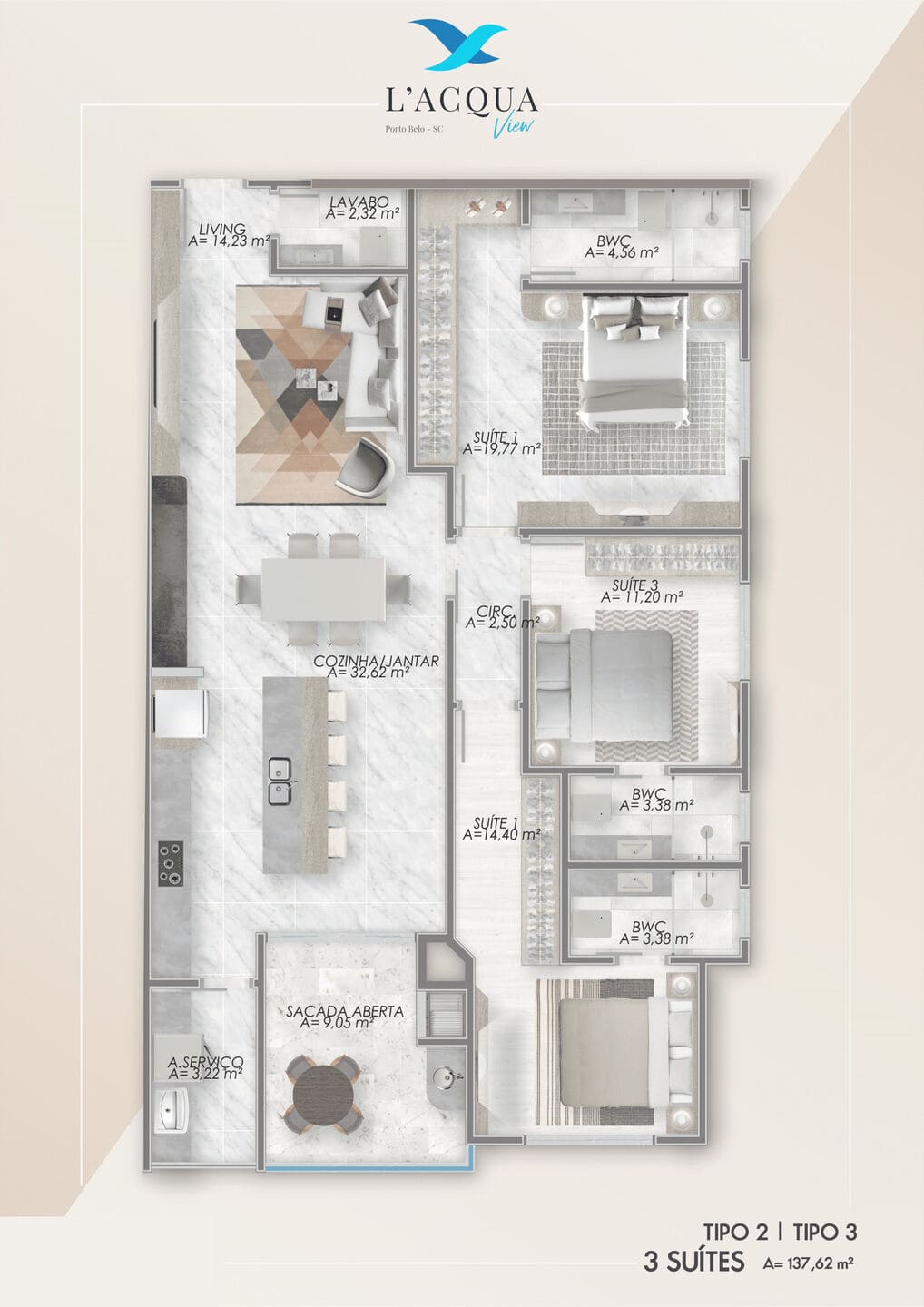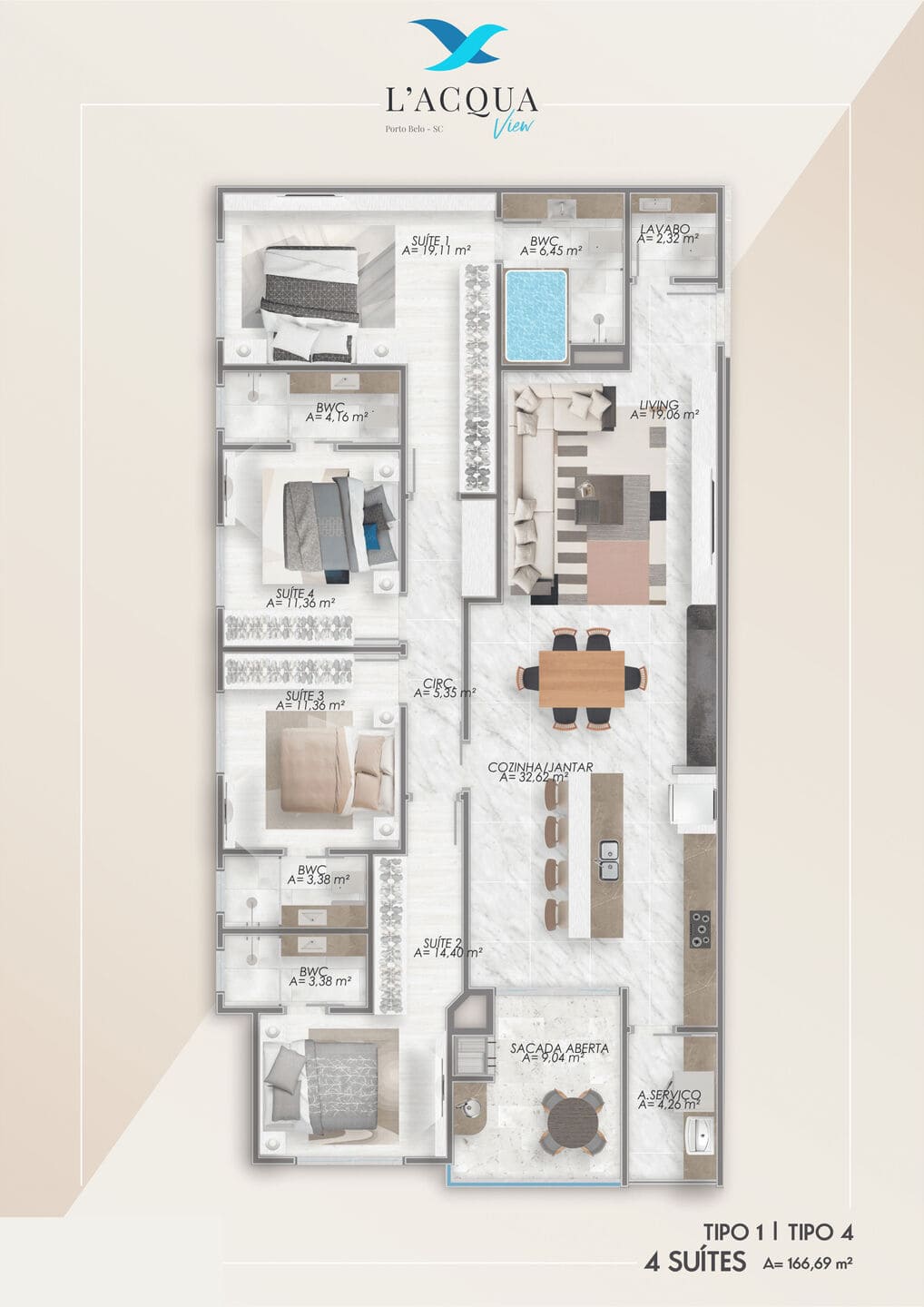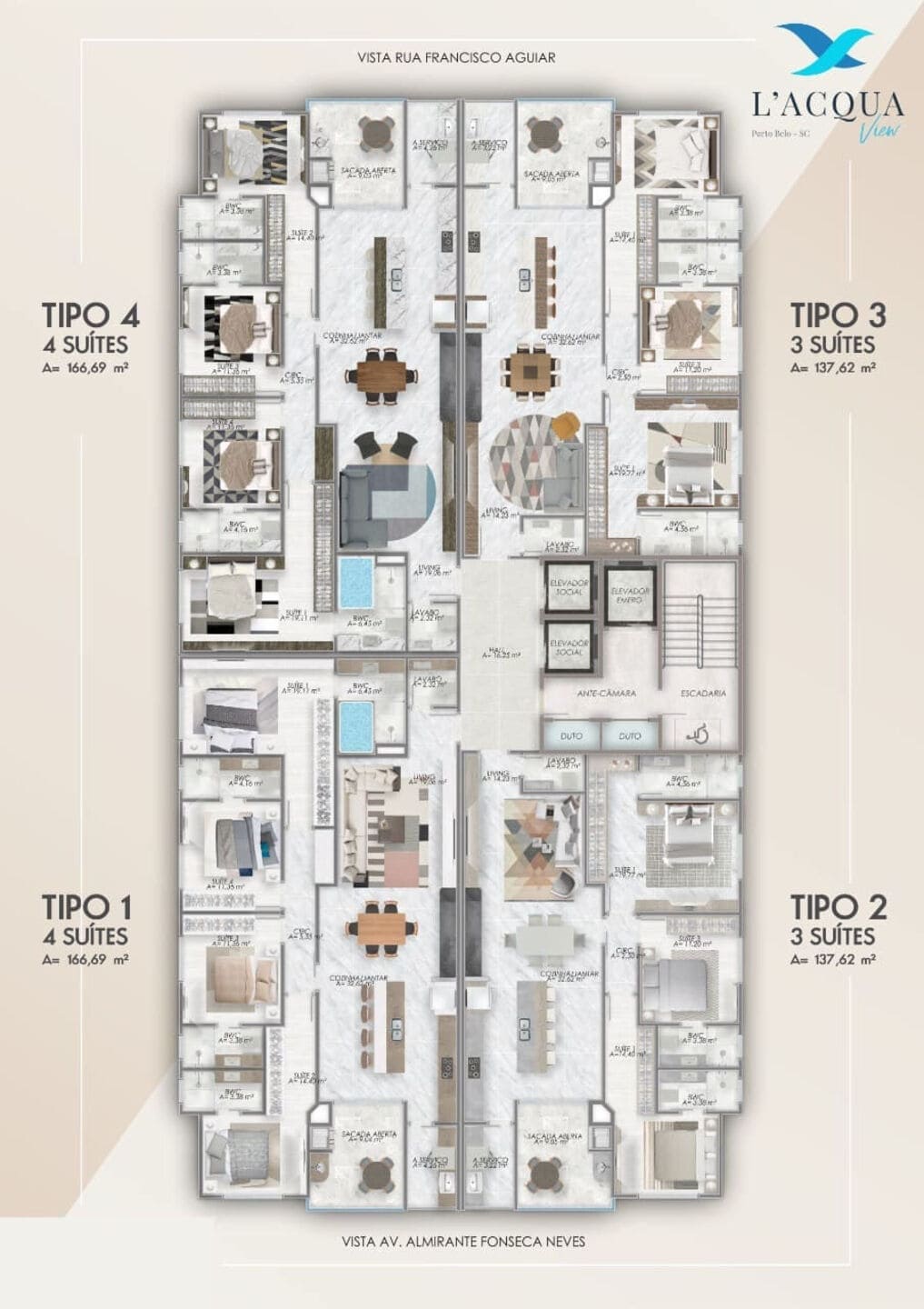 L’Acqua View, cada planta reflete o equilíbrio entre design e funcionalidade. As unidades tipo 1 e 4 oferecem 4 suítes e 3 vagas, com 164,45 m² de área privativa. Já os tipos 2 e 3 contam com 3 suítes e 2 vagas, em 135,89 m². A distribuição inteligente privilegia o bem-estar com living espaçoso, cozinha integrada, lavabo, área de serviço separada e suítes confortáveis.