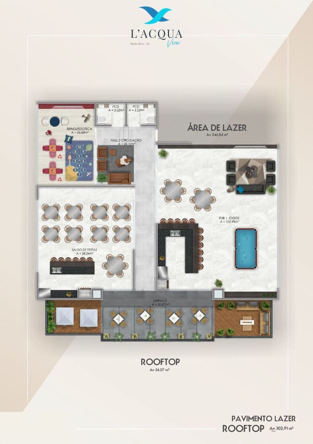 L’Acqua View, com aproximadamente 976,70 m², a área de lazer, foi pensada para proporcionar momentos únicos com sofisticação e bem-estar. Piscina adulto e infantil com bar molhado, spa completo, prainha e sauna a vapor garantem relaxamento total. Para quem valoriza o convívio, o empreendimento oferece salões de festas – incluindo um panorâmico no rooftop – além de espaços gourmet, wine bar, pub e praça do fogo.