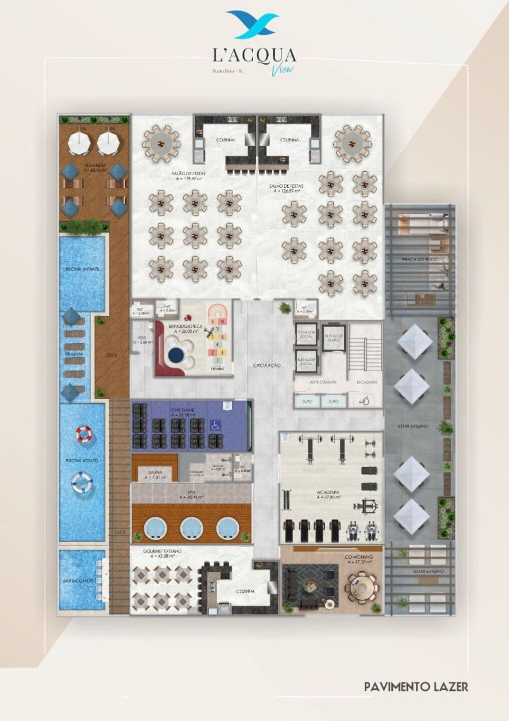 Os momentos em família ganham cor com brinquedoteca, playground, cinegame e coworking decorado. Já para o equilíbrio do corpo e mente, a academia conta com equipamentos modernos em um ambiente elegante. O L’Acqua View reúne todos os elementos que fazem da vida uma celebração diária, tudo com a vista deslumbrante de Porto Belo – SC como cenário.