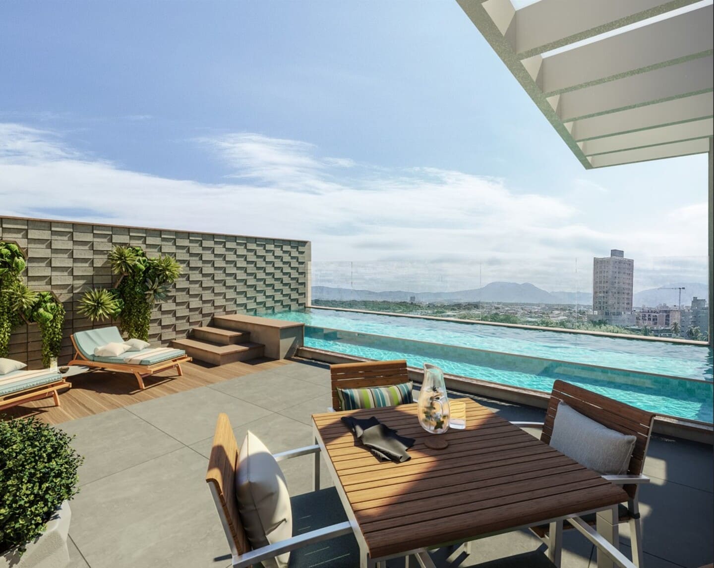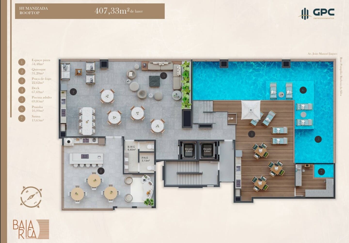 Residencial Baía Rica revela um verdadeiro cenário de encantamento com 1.202,78 m² de lazer distribuídos entre um rooftop panorâmico e um pavimento completo, que impressiona pela beleza e funcionalidade. A piscina com borda infinita, integrada à prainha e à sauna com design refinado, proporciona um mergulho em tranquilidade com vista definitiva para o mar.